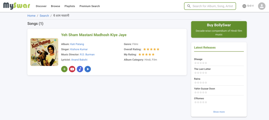 It may not be apparent to the average user (and it should not be), but the search function on MySwar is quite forgiving. It isn’t fuzzy search, but it does consider the possibility that the same Hindi word may be spelt differently by different users. This is important given that the transliteration of Hindi words into English in Hindi film song and film titles can be quite random.